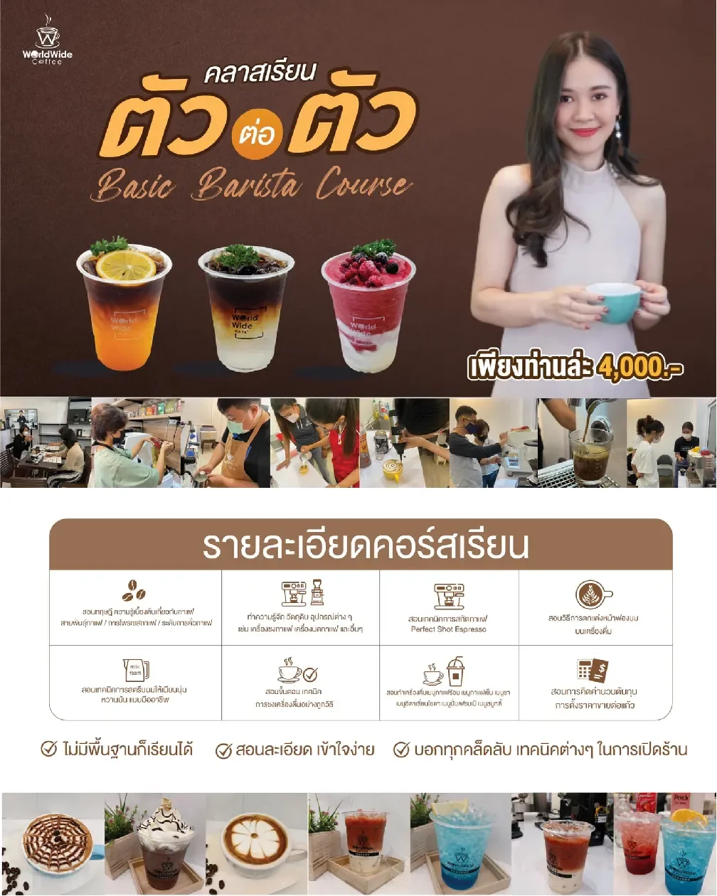 คอร์สเรียนชงกาแฟ ขั้นพื้นฐาน สอนทำกาแฟ-เครื่องดื่ม แบบส่วนตัว เหมาะสำหรับผู้เริ่มต้นเรียนรู้การเปิดร้านกาแฟ หรือผู้เริ่มต้นเรียนรู้ด้านการทำกาแฟ เรียนรู้ตั้งแต่ทฤษฎีไปจนถึงปฎิบัติด้วยตนเอง ฝึกลองทำลองชงสอนชงเมนูเครื่องดื่มกว่า 30 เมนู อาทิเช่น กาแฟร้อน / เย็น / ปั่น โกโก้ ชาเขียว ชาไทย อิตาเลี่ยนโซดา และสมูทตี้ ได้เรียนรู้อย่างครบวงจร