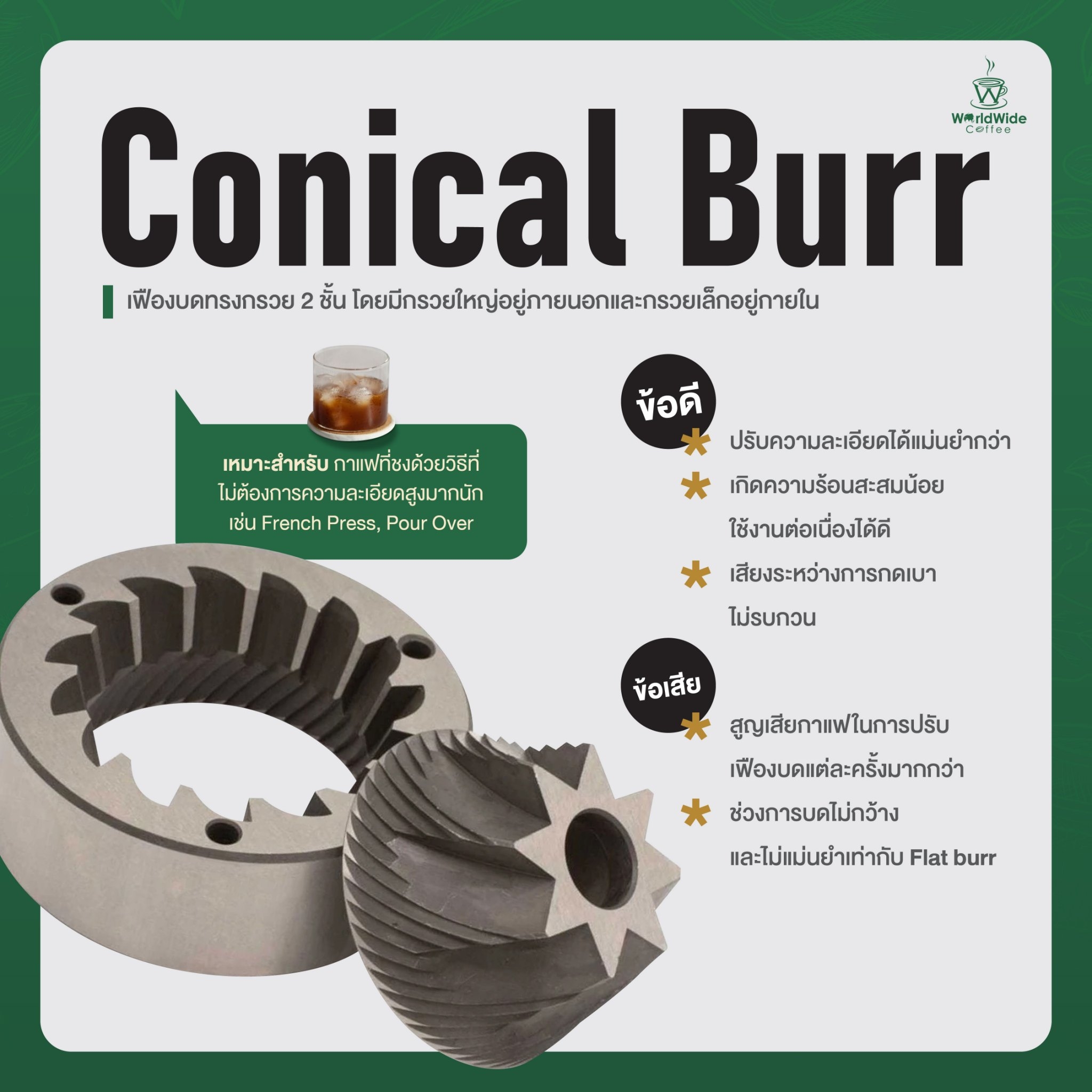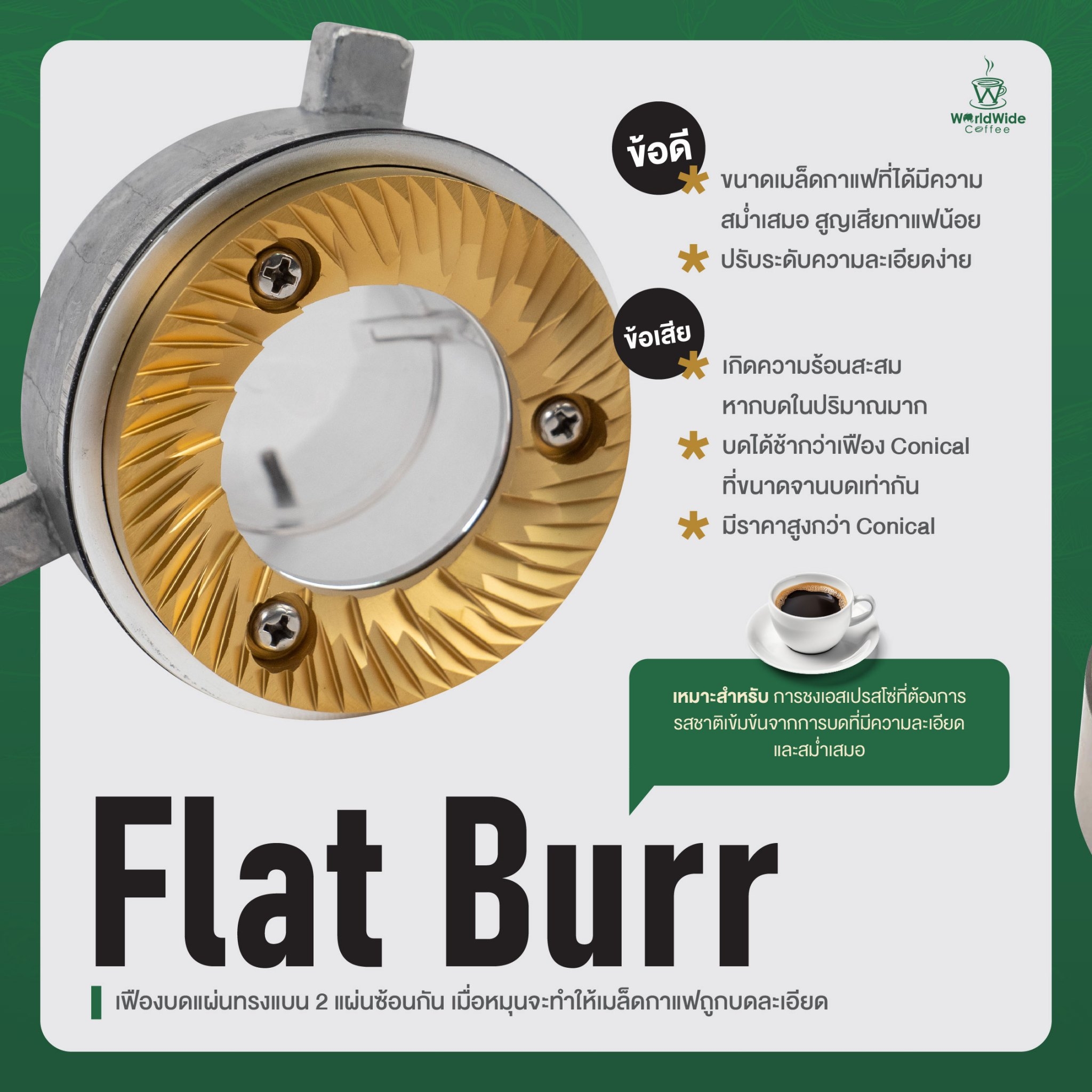 - ช่วงการบดไม่กว้าง และไม่แม่นยำเท่ากับ Flat burr